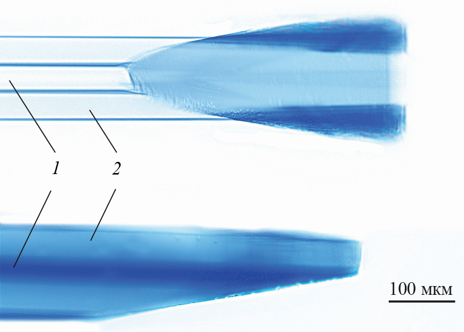 Рис. 3. Изготовленное волокно под микроскопом Nikon Eclipse LV150N c 20-кратным увеличением: 1 – сердцевина оптического волокна, 2 – кварцевая оболочка.