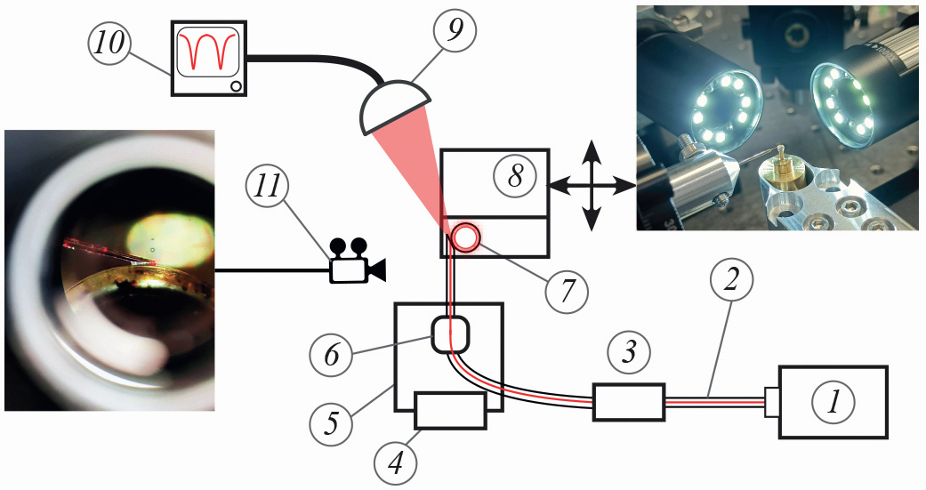 В качестве источника излучения в установке (рис. 4) использовались два источника излучения 1: первый (тестовый) лазер видимого диапазона с рабочей длиной волны 650 нм для подвода элемента связи к микрорезонатору, этот источник использовался для визуализации излучения на поверхности микрорезонатора и упрощения процесса юстировки и второй – диод с распределенной обратной связью для измерения добротности с рабочей длиной волны 1546 нм, он являлся источником излучения рабочей длины волны устройства и использовался для измерения добротности. Микрорезонатор 7 с МШГ диаметром 5 мм с радиусом кривизны 0.5 мм, изготовленный из фторида магния методом алмазного точения с последующей полировкой абразивными суспензиями [20], устанавливался при помощи зажима в подачу NanoMax 313D Thorlabs 8, позволявшую регулировать его положение по трем координатам, включая настройку по высоте, с точностью 1 мкм. Изготовленное полированное волокно 2, подключенное к источнику накачки 1 и проходящее через контроллер поляризации General Photonics PLC-003-S-90 3, ставилось в гониометр 7R7 Standa 6, расположенный на пьезоподаче NFL5DP20/M Thorlabs 5, позволявшей регулировать зазор между резонатором и элементом связи с точностью 0.05 мкм и управлявшейся пьезоэлементом 4. Визуальный контроль места контакта элемента связи с резонатором осуществлялся при помощи системы из двух камер 11, сфокусированных на точку контакта резонатора и элемента связи, расположенных в перпендикулярных плоскостях.