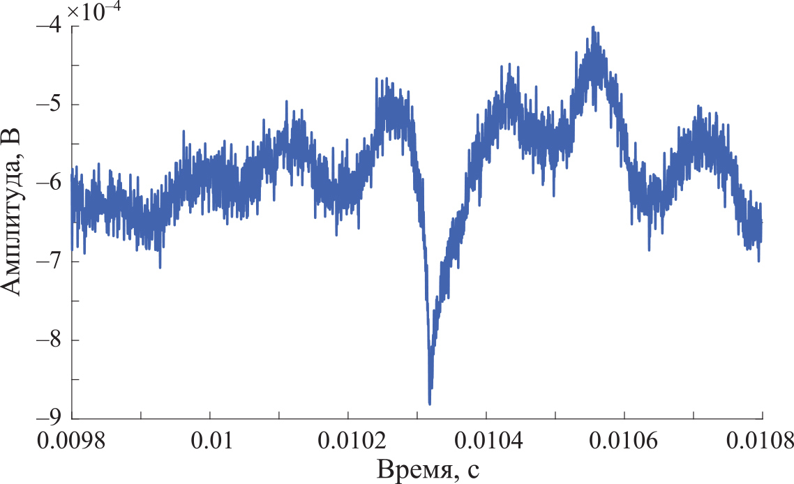 Рис. 5. Измеренная временная зависимость амплитуды сигнала мод микрорезонатора на фотодетекторе. Резонансный провал свидетельствует о возбуждении моды в микрорезонаторе.