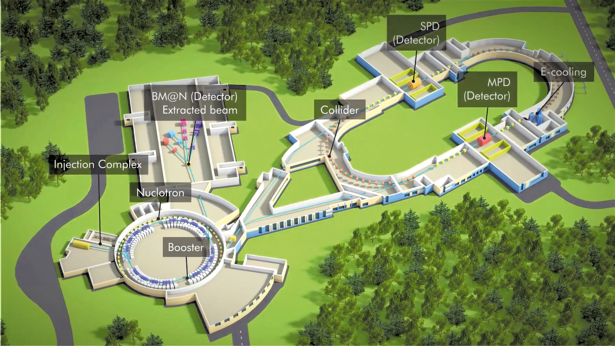 Рис. 1. Комплекс установок NICA в ОИЯИ, Дубна. Установка BM@N размещена на выведенном пучке нуклотрона.