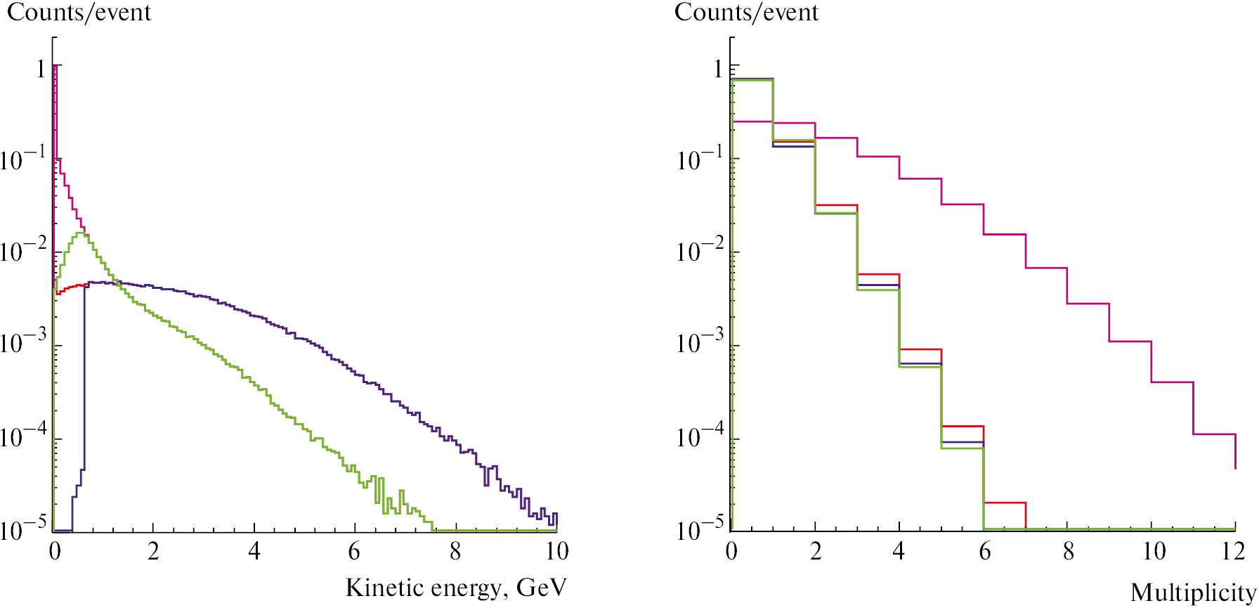 Рис. 9. Энергетические спектры нейтронов (слева) и распределения по множественности (справа) для первичных (синий) и фоновых (зеленый) нейтронов на входной поверхности детектора HGND с отбором по времени менее 25 нс. Красная и розовая кривые соответствуют первичным и фоновым нейтронам без отбора по времени.