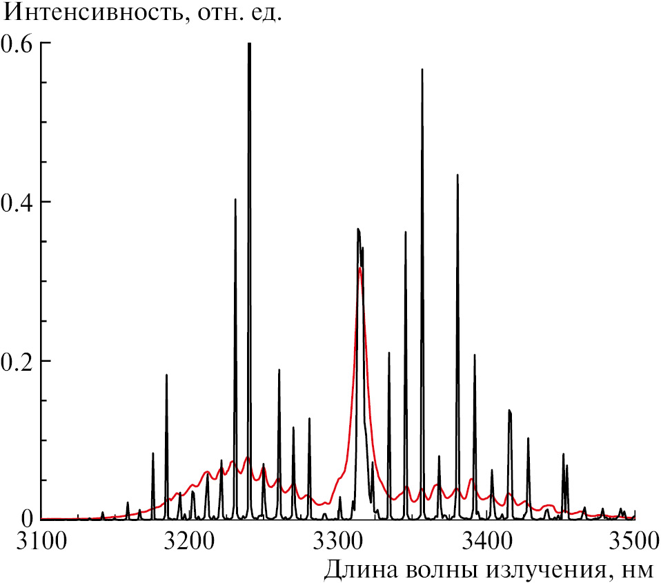 Рис. 3. Экспериментально измеренный спектр поглощения газовой смеси на основе азота с примесью метана (N2 + 954 ppm CH4) (красная кривая) в сравнении с данными базы данных HITRAN (черная кривая).