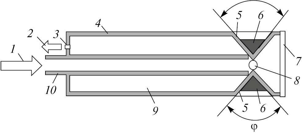Рис. 1. Конструкция компактного излучателя: 1 — входной поток аргона, направленный в колбу излучателя, 2 — выходной поток аргона из колбы в окружающий воздух, 3 — отверстие в левом торце колбы, 4 — кварцевая трубка большего диаметра, 5 — часть трубки 4, имеющая форму конуса с закругленной вершиной, 6 — электроды, 7 — выходное окно из MgF2, 8 — область разряда, 9 — внутренняя часть камеры, заполняемая аргоном, 10 — трубка малого диаметра.