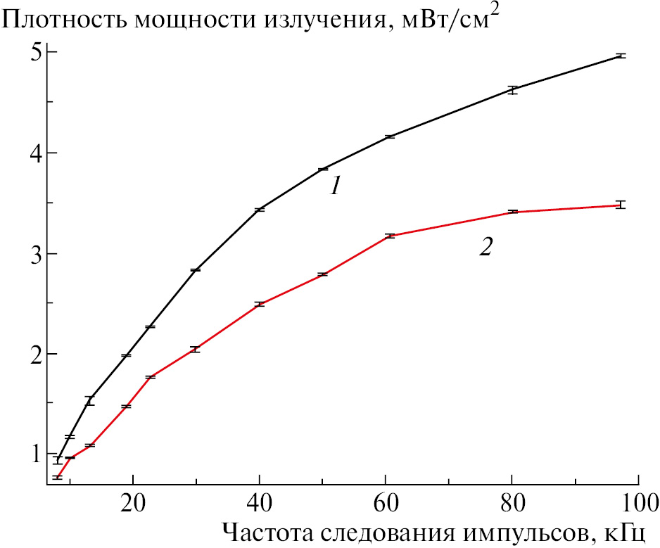 Зависимости плотности мощности излучения димеров аргона в центре выходного пучка, регистрируемого через окно размером 3×3 мм2, от частоты следования импульсов представлены на рис. 3.