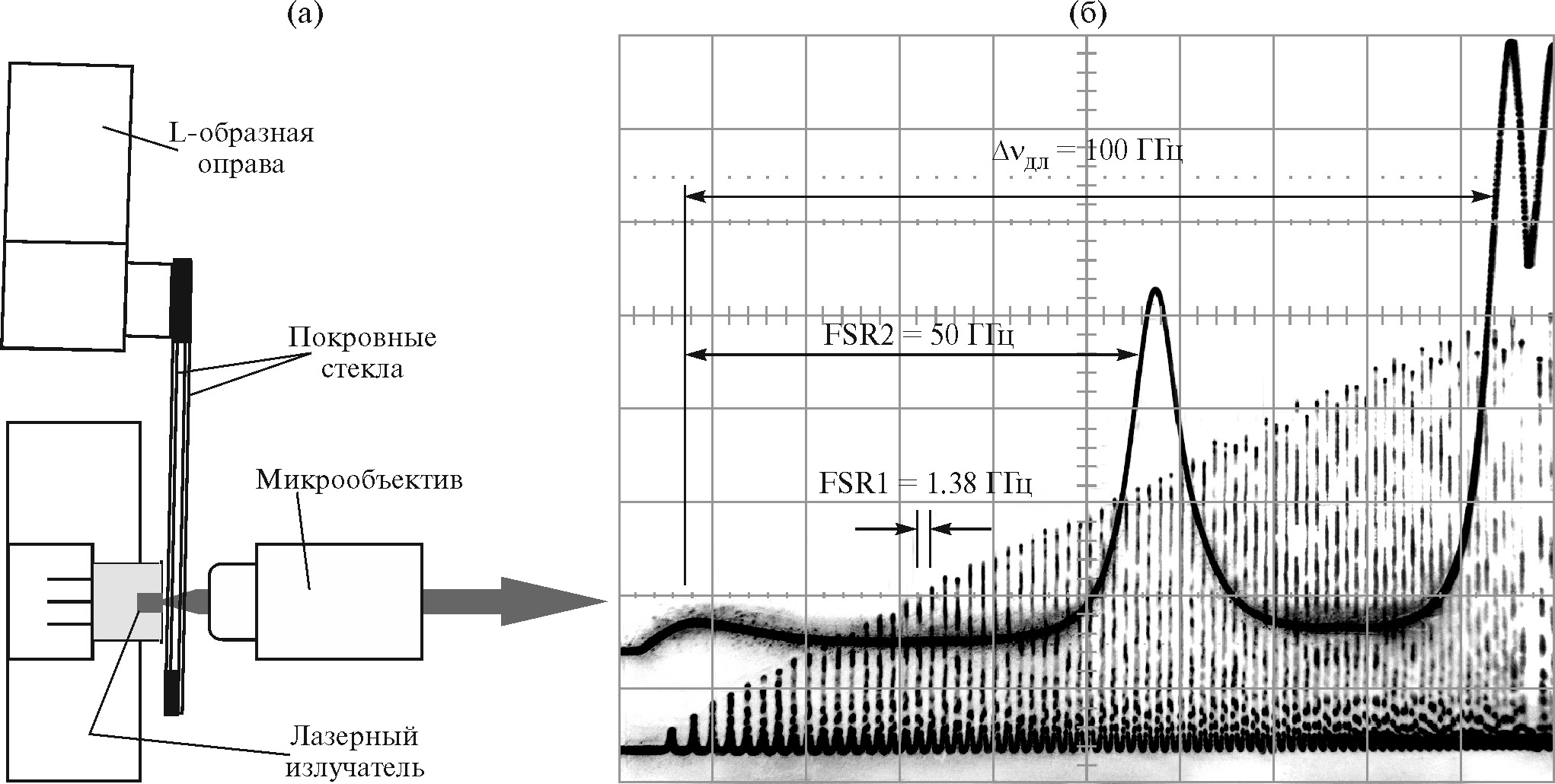 Конструктивно резонансный тандемный отражатель представлял собой два покровных стекла от микроскопа размером 20×20 мм2 и толщиной около 100 мкм, которые были собраны в пакет с воздушным зазором 100–150 мкм. Пакет покровных стекол был прикреплен к стандартной двухкоординатной L-образной оправе, размещенной вблизи лазерного держателя и коллимирующего микрообъектива. С помощью винтов оправы осуществлялись прецизионные изменения линейного и угловых положений покровных стекол относительно выходной грани лазера. Тем самым выполнялась настройка резонансного отражателя на селекцию заданной лазерной моды вблизи вершины контура усиления ДЛ-излучателя. В свою очередь, положение вершины контура усиления лазера можно смещать в диапазоне длин волн изменением температуры полупроводникового кристалла.
