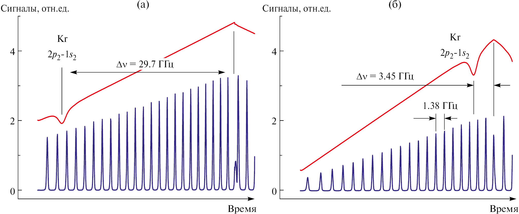Рис. 4. Определение коэффициента токовой перестройки лазерной частоты. Верхний сигнал показывает положение линии криптона, а нижний сигнал соответствует резонансам интерферометра-1. При измерениях температура корпуса лазера (T = 23.5 ºC) и амплитуда сканирования тока накачки (DI = 14 мА) не изменялись, а постоянная составляющая лазерного тока устанавливалась равной 52.7 мА (а) и 39.5 мА (б).