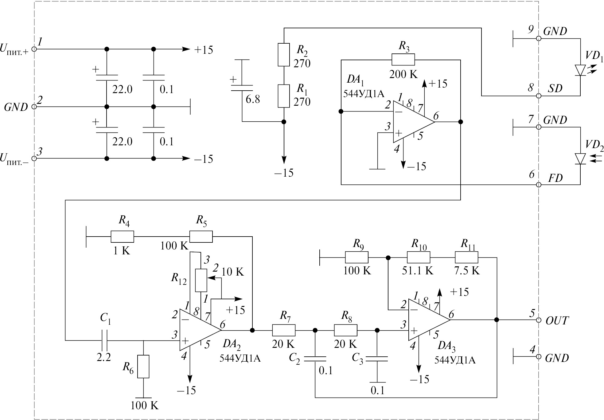 Плата усилителя служит для усиления сигналов ОАП и входит в состав приемников. На рис. 1 приведена принципиальная схемы платы усилителя. Серой штриховой линией обозначены элементы, входящие непосредственно в состав платы, остальное — подключаемые к ней устройства. В частности, VD1 и VD2 являются парой светодиод–фотодиод, входящей в состав ОАП.