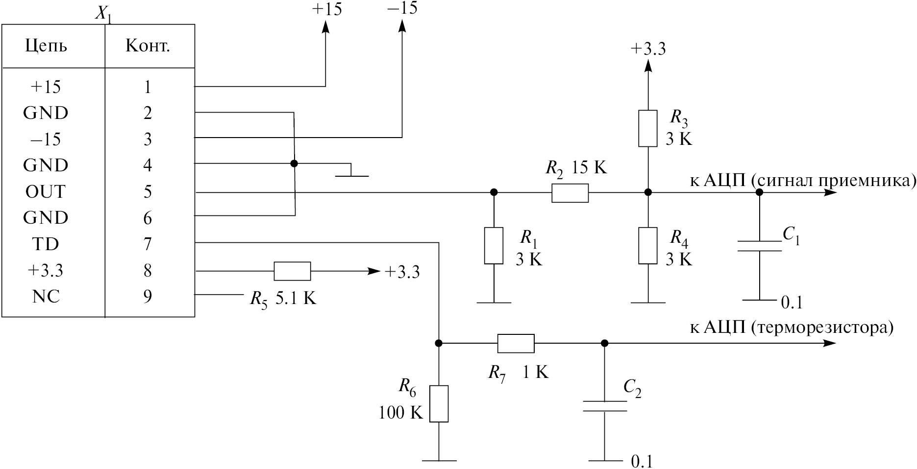 На рис. 3 показаны входные цепи платы электроники для измерения размаха сигналов приемника и датчика температуры, также входящего в его состав. Разъем X1 служит для питания приемников (± 15 В, GND), передачи сигнала приемников (OUT) и датчиков температуры (TD).