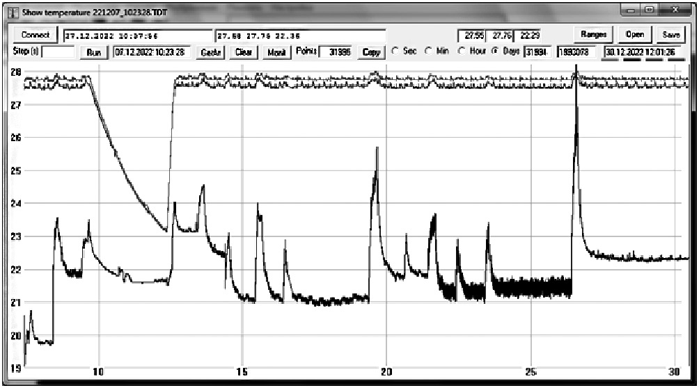 На рис. 3 показано основное диалоговое окно приложения “Show temperature”. К измерителю подключены три датчика: два установлены на полюсах магнита (верхние графики), один в комнате (нижний). Значения по горизонтальной шкале измерены в днях месяца, по вертикальной — в градусах Цельсия. Две верхние линии на рис. 3 отображают температуру магнита, нижняя линия — температуру воздуха в экранированной комнате, где установлена магнитная система. Изменение температуры магнита на несколько градусов Цельсия (верхние линии на рис. 3) связано с отключением термостатирования. Изменение температуры в экранированной комнате связано с включением и отключением освещения в ней и работой сплит-системы. Обнаружено, что при заметных изменениях температуры в комнате (на несколько градусов Цельсия) происходит изменение температуры полюсов магнита. Эти небольшие изменения температуры магнита связаны, видимо, с неточной настройкой параметров PID-регулирования штатного терморегулятора магнитной системы.