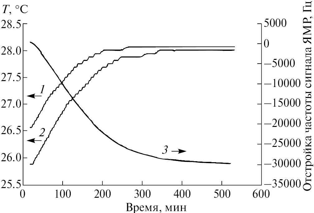Мы провели эксперимент по сравнению динамики выхода температуры магнитной системы на рабочий режим и изменению при этом частоты ЯМР-сигнала. На рис. 5 отображено изменение температуры полюсов магнита (линии 1, 2) после включения термоконтроллера системы термостатирования томографа. Ступеньки на линиях 1 и 2 обусловлены величиной чувствительности термодатчиков (0.0625°С), т.е. дискретностью измерений. Плато при достижении установленной температуры означает, что температура на этом участке не выходит за указанный предел. Отображаемые на графиках изменения температуры, меньшие этого значения связаны с процедурой усреднения. Линией 3 представлен график изменения частоты ЯМР-сигнала от времени. Измерение частоты сигнала ЯМР началось одновременно с включением системы термостатирования магнита.