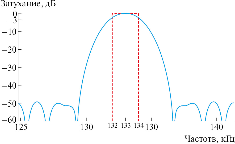 Для выделения интересующей частоты используется узкополосный цифровой полосовой фильтр 1000-го порядка с полосой пропускания 2 кГц. Характеристика фильтра, настроенного на центральную частоту 133 кГц, представлена на рис. 5.