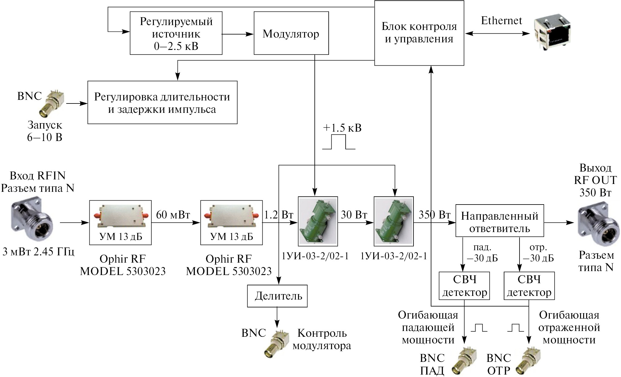 Усилитель мощности УМП-300 предназначен для усиления по мощности сигналов частоты диапазона от 2450 до 2950 МГц. Максимальная мощность выходного сигнала составляет 300 Вт. Структурная схема УМП-300 представлена на рис. 1. Входной сигнал от источника сигнала с уровнем +2–4 дБ усиливается линейкой усилительных твердотельных модулей Ophir RF MODEL 5303023 до уровня 1–2 Вт и подается на вход двухкаскадного усилителя на триодных коаксиально-волноводных модулях 1УИ-03/02-1. Режим работы триодных каскадов — импульсный с анодной модуляцией.
