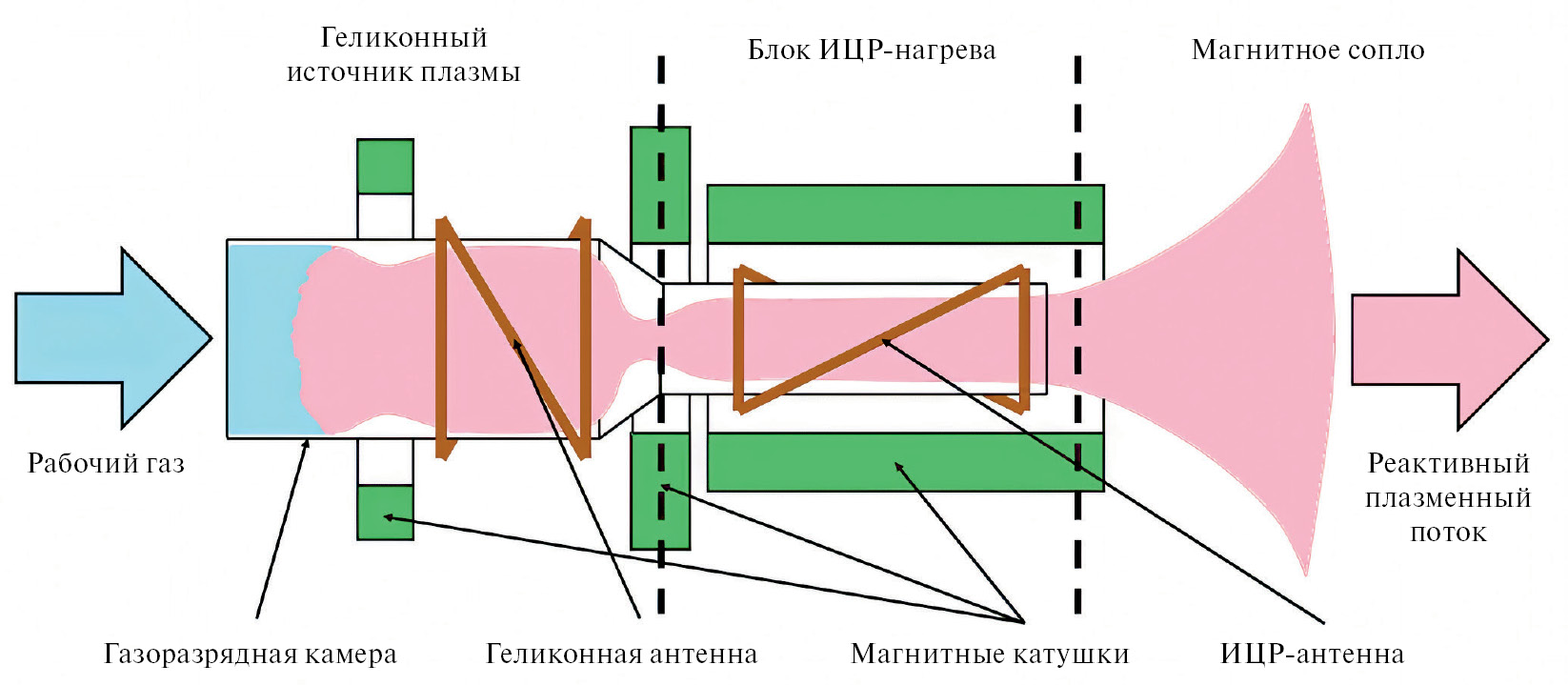 Рабочий газ, двигаясь в БПРД, принципиально проходит через три ступени двигателя: геликонный источник плазмы (ГИП), блок ионного циклотрон-резонансного нагрева (ИЦРН) и магнитное сопло (МС). В ГИП происходит ионизация рабочего газа и формируется истекающий плазменный поток. В блоке ИЦРН происходит нагрев ионов плазменного потока до температуры в сотни электронвольт. В МС происходит формирование истекающей реактивной струи, а также вырабатываются создаваемые двигателем тяга и удельный импульс. Все три блока связаны между собой единой конфигурацией магнитного поля, которое не только обеспечивает термоизоляцию плазменного потока от стенок двигателя, но и принимает непосредственное участие в плазменных процессах, протекающих во всех трех ступенях двигателя.