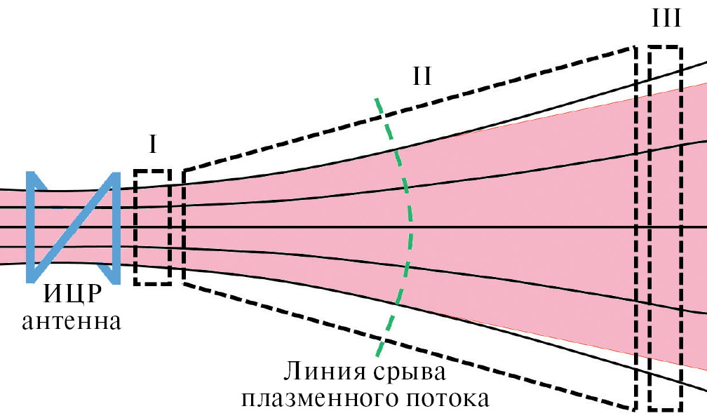 Область I находится непосредственно за ИЦР-антенной. Основная цель исследований в этой области заключается в определении входных параметров плазменного потока (степени ионизации и радиальных распределений основных плазменных параметров), его полного энергосодержания, а также в определении долей энергии, вложенных в ионы и в электроны.