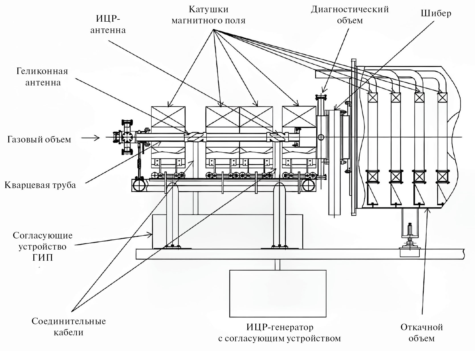 Описанный далее диагностический комплекс создан на стенде ПН-3. Стенд ПН-3 является макетом БПРД и имеет все три присущие БПРД блока: ГИП, блок ИЦРН и МС. Основой стенда является ГРК, выполненная из кварцевой трубы внутренним диаметром 60 мм и длиной 1500 мм. На трубе размещены ВЧ-антенны, а сама труба помещена во внешнее магнитное поле, создаваемое магнитными катушками.