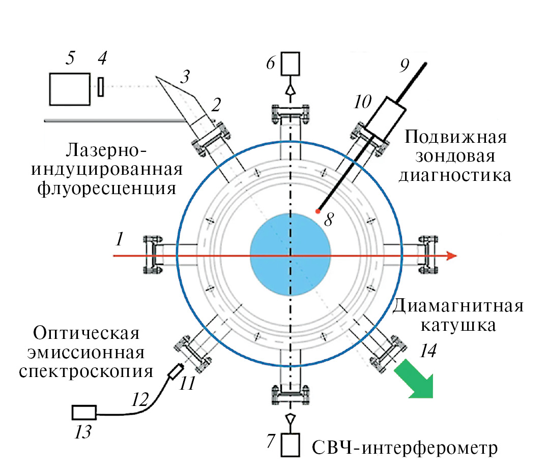 Рис. 4. Схема расположения диагностических устройств для измерения параметров плазмы в диагностическом объеме стенда ПН-3: 1 – вводимый лазерный луч, 2 – линза, 3 – зеркало, 4 – оптический фильтр, 5 – ФЭУ, 6 – приемник интерферометра, 7 – передатчик интерферометра, 8 – устройство для зондовой диагностики, 9 – подвижная штанга с МП, 10 – уплотняющее устройство с дифференциальной откачкой, 11 – коллиматор, 12 – оптический кабель, 13 – спектрометр или монохроматор, 14 – вакуумная откачка и вакууметрия.