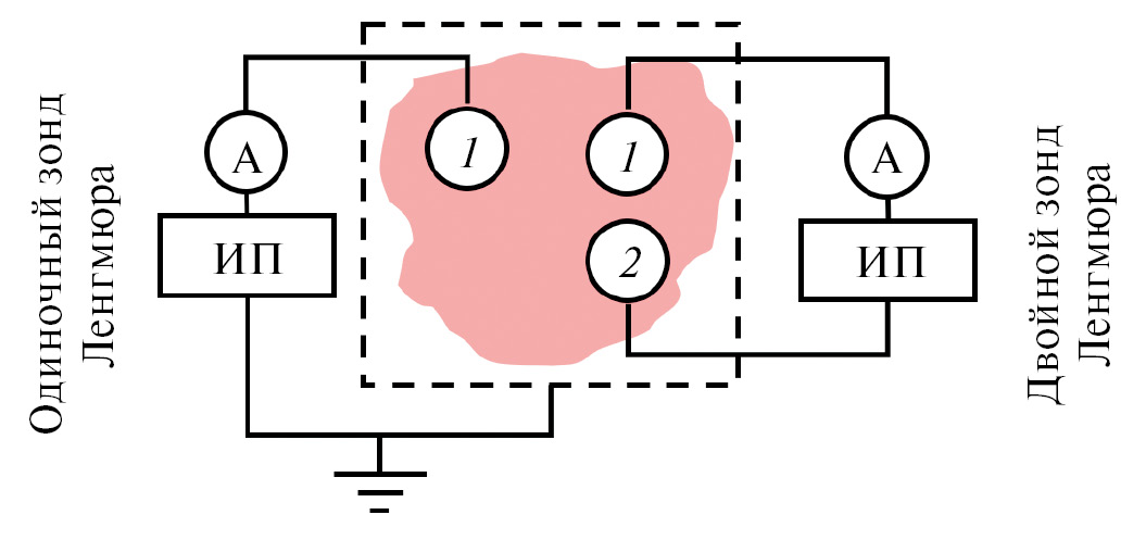 Двойной зонд Ленгмюра сложнее в изготовлении, чем одиночный, однако он имеет большую устойчивость к синфазным наводкам и его проще использовать с точки зрения обработки экспериментальных данных. Принципиальные схемы измерения одиночным и двойным зондами Ленгмюра приведены на рис. 6.