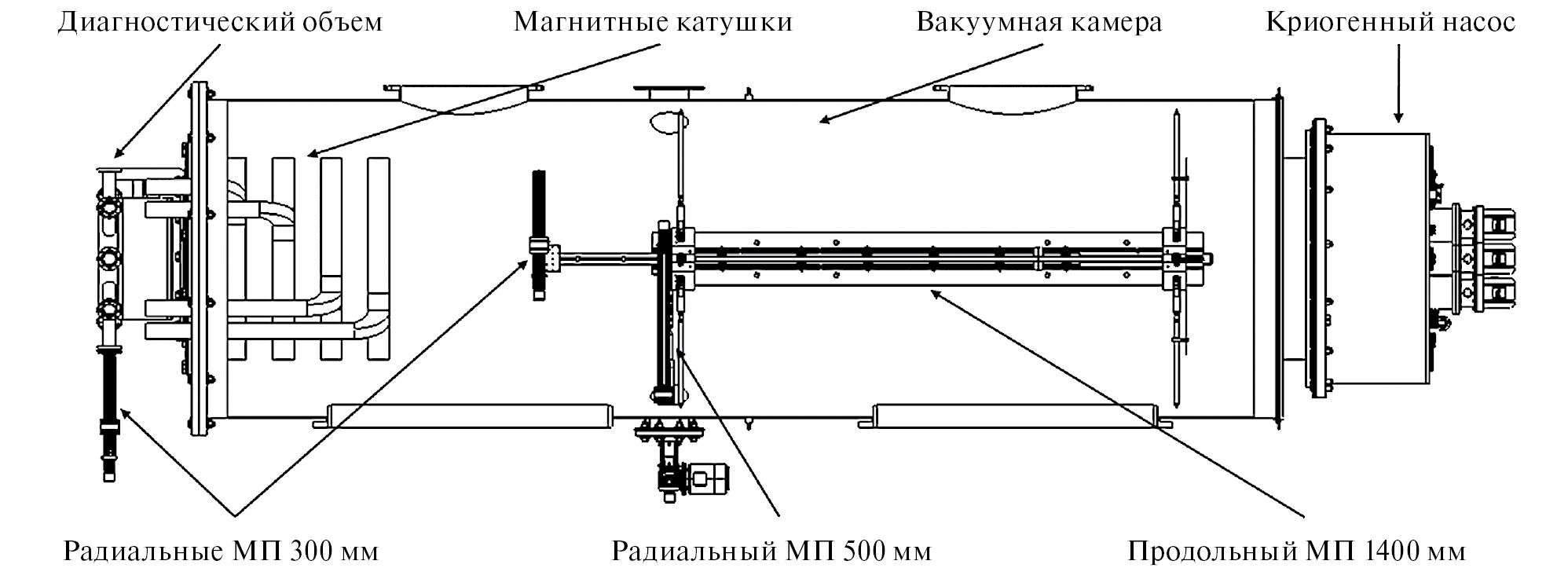 Исследование в этой области МС на стенде ПН-3 реализовано за счет использования радиального МП с полным ходом 500 мм, закрепленного на неподвижной части (станине) продольного МП (см. рис. 8, 9). Также массивные измерительные приборы, которые не требуют перемещения, ставятся прямо на дно откачного объема.