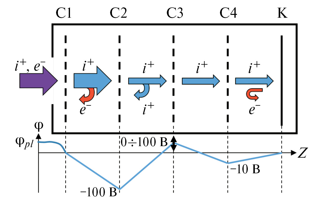 Классический сеточный анализатор принципиально состоит из четырех сеток, на которые подаются различные потенциалы. Первая сетка либо заземляется, либо остается под плавающим потенциалом. Она предназначена для физического разделения потенциала плазменного потока от потенциала, возникающего внутри анализатора. На вторую сетку подается запирающий отрицательный потенциал, препятствующий прохождению через нее электронов. На третью сетку подается переменный положительный потенциал, который и производит сепарацию ионов по энергиям (сетку могут преодолеть только те ионы, энергия которых выше потенциала сетки). На четвертую сетку подается относительно небольшой отрицательный потенциал, служащий для предотвращения выбивания электронов из коллектора. Частицы, сумевшие преодолеть все сетки, попадают на коллектор. Зависимость тока, текущего через коллектор, от потенциала третьей (запирающей ионы) сетки называется кривой запирания анализатора. При ее дифференцировании получается функция распределения ионов по энергиям. Принципиальная схема сеточного анализатора приведена на рис. 10.