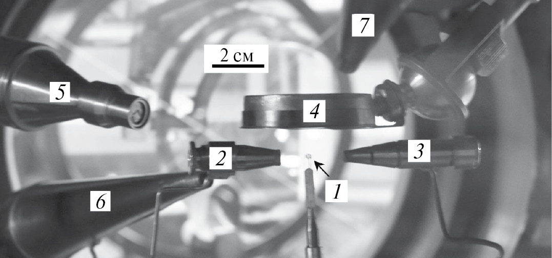 Рис. 1. Изображение мультиобскуры: 1 – МОК-мишень, 2 – регистратор с мультидиафрагмой, 3 – регистратор с диафрагмой с большим отверстием, 4 – индиевый образец, 5–7 – рентгеновские камеры обскуры.