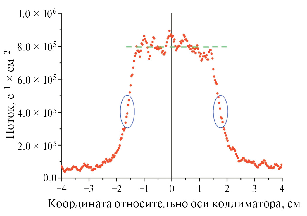 Средние значения плотности потока нейтронов на плато профиля плотности нейтронного потока на различных расстояниях от коллиматора при перемещении в двух взаимно перпендикулярных направлениях приведены на рис. 3. На рисунке также указаны средние границы плато профиля плотности нейтронного потока на различных расстояниях от коллиматора при перемещении в двух взаимно перпендикулярных направлениях.