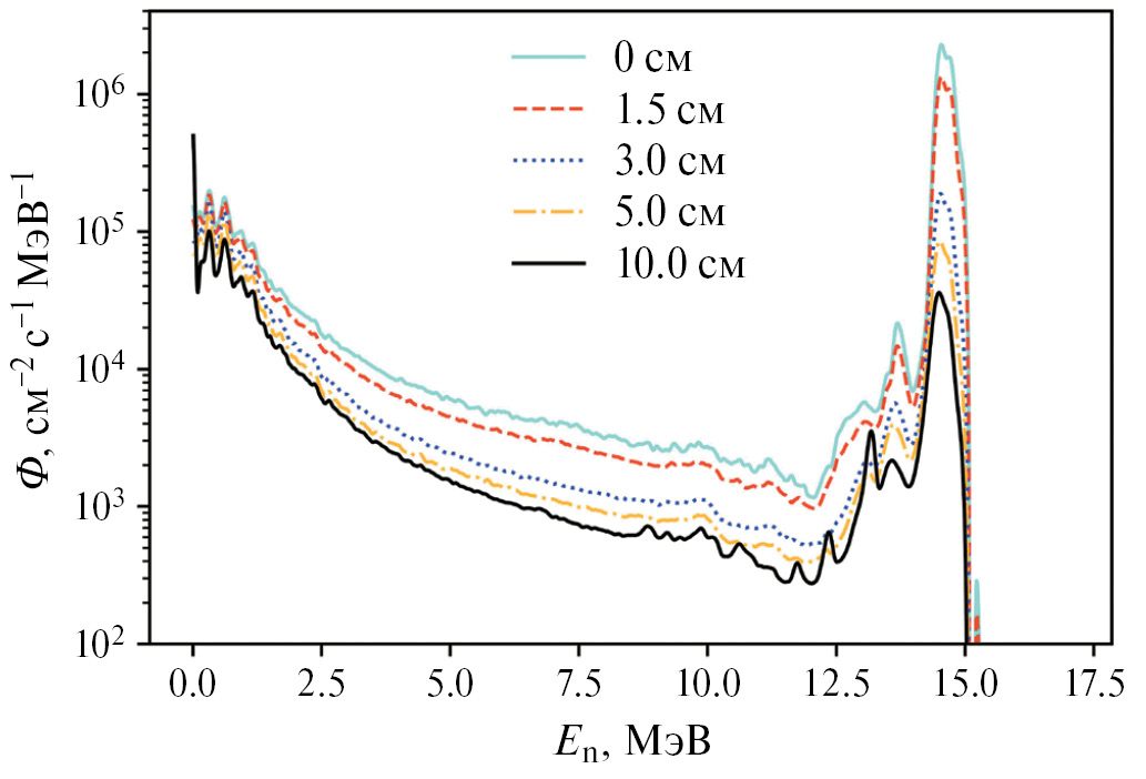 Проведены расчеты транспорта нейтронного излучения от мишени нейтронного генератора через стальной коллиматор. Для проведения расчетов был использован открытый код OpenMC [2], аналогичный по своим возможностям коду MCNP [3]. OpenMC позволяет проводить моделирование переноса нейтронного излучения в трехмерной геометрии методом Монте-Карло. В результате было получено пространственное распределение плотности нейтронного потока в окрестности коллиматора, а также энергетические спектры нейтронов. На рис. 4 представлены расчетные нейтронные спектры от нейтронного генератора НГ-14 за свинцовой пластиной, установленной дляподавления γ-излучениядля различных расстояний от оси коллиматора. Из графика следует, что по мере удаления от оси коллиматора существенно ослабляется поток нейтронов с энергией 14 МэВ.