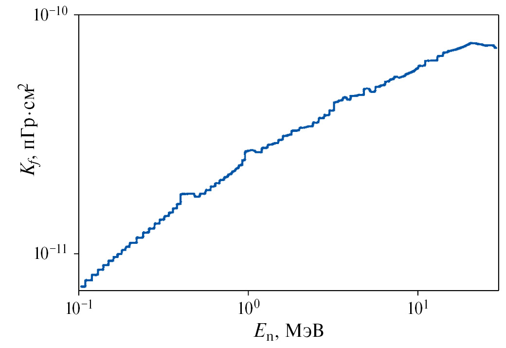 где Ki – керма-фактор для некоторого вещества в i-й энергетической группе; fi – флюенс нейтронов в i-й энергетической группе. Керма-факторы для некоторых веществ могут быть взяты из ICRU26 [8, 9]. Керма-факторы для воды в диапазоне энергий от 0.1 до 30 МэВ представлены на рис. 8.