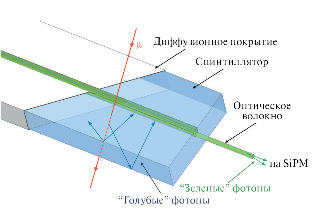 Основным детектирующим элементом ССД является сцинтилляционный стрип (рис. 3) из полистирола с добавками паратерфенила (1.5%) и сцинтиллятора POPOP (1,4-ди-[2-(5-фенилоксазолил)]-бензол) (0.04%). Стрип изготовлен с применением технологии экструзии листовых заготовок сцинтиллятора в форме полосы размером 2960 × 23 × 7 мм3. Для обеспечения внутреннего диффузного отражения фотонов внешняя поверхность каждого стрипа покрыта тонким слоем вспененного полистирола, имеющего высокий коэффициент диффузного отражения света (около 95%).