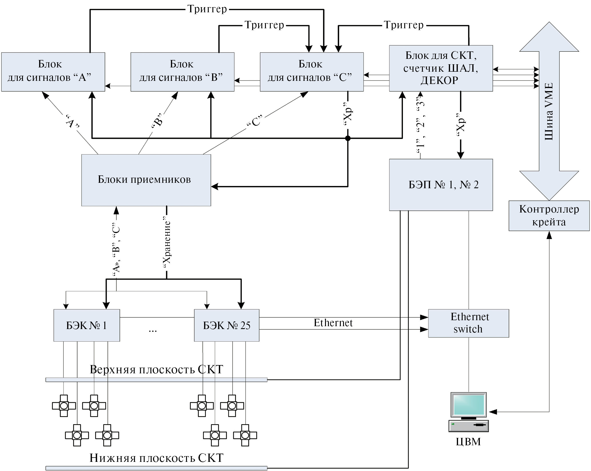 Сигнал “Хранение” блок СКТ получает из блока “С” и передает его в БЭП. При получении сигнала “Хранение” модули АЦП всех БЭК и БЭП проводят полную оцифровку зарегистрированных сигналов и передают оцифрованные данные на процессорные платы, которые пересылают их по линии связи Ethernet на центральную ЭВМ.