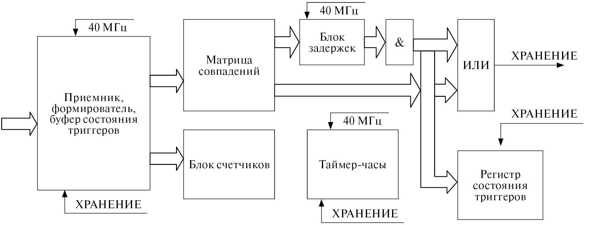 – приемник, формирователь по длительности и циклический буфер состояния триггерных сигналов первого уровня с частотой дискретизации 40 МГц;