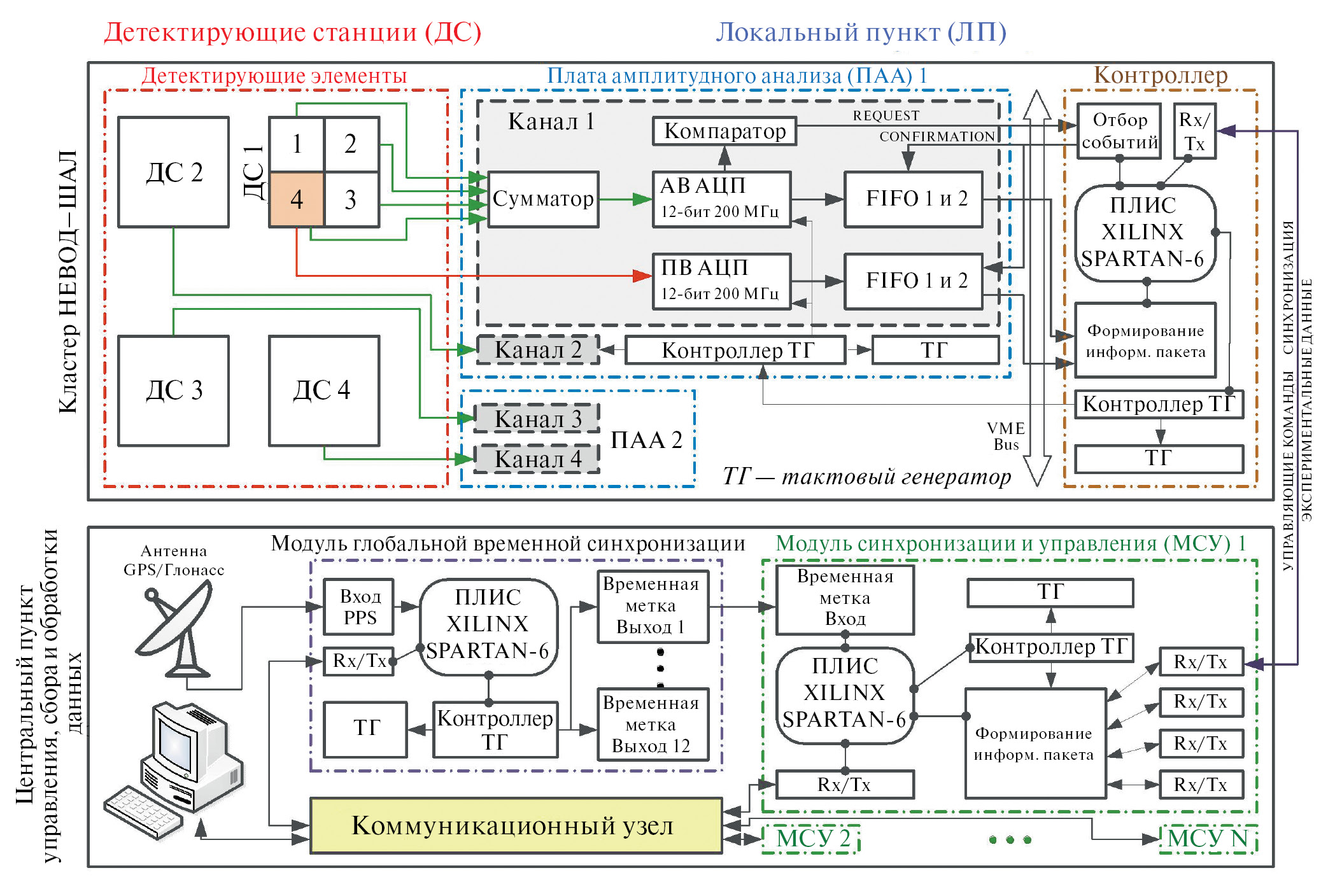 Установка НЕВОД–ШАЛ имеет кластерную организацию и включает в себя девять независимых кластеров, расположенных вокруг экспериментального комплекса НЕВОД на крышах лабораторных корпусов НИЯУ МИФИ и на поверхности грунта. Каждый кластер состоит из 16 сцинтилляционных счетчиков для регистрации электронно-фотонной компоненты ШАЛ, объединенных в четыре детектирующие станции (ДС), расположенные в вершинах прямоугольника с характерными размерами около 15 × 15 м2 . Расстояния между центрами кластеров составляют около 50 м. Система сбора и обработки данных установки НЕВОД–ШАЛ включает два основных структурных элемента: кластер и центральный пункт управления, сбора и обработки данных. Функциональная схема системы сбора и обработки данных НЕВОД–ШАЛ представлена на рис. 5.