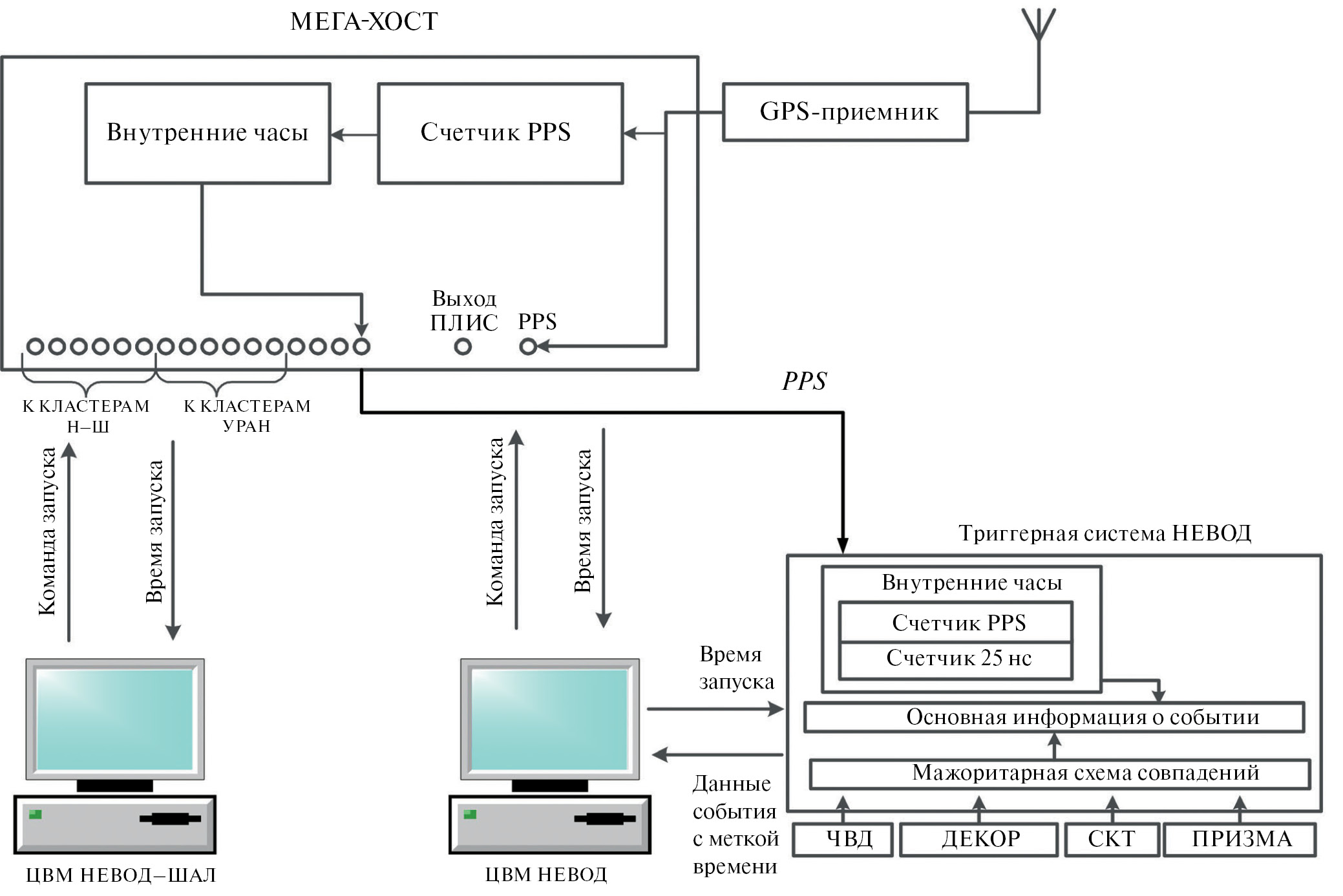 При таких временных характеристиках возможна лишь гибридная организация триггирования, первичная обработка и сохранение экспериментальных данных может осуществляться только на различных вычислительных машинах, а последующая обработка совместных данных требует сшивки событий. Такая сшивка осуществляется по временным меткам, присваиваемым каждому событию. Основным источником временной информации служит модуль глобальной временной синхронизации, расположенный в центральном пункте установок НЕВОД–ШАЛ и УРАН, который обеспечивает точность временной привязки данных этих установок около 10 нс.