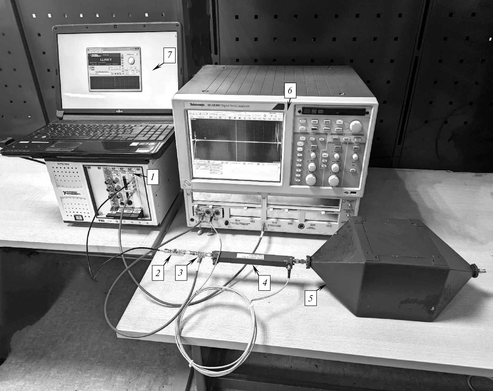 Рис. 1. Измерительная установка: 1 – генератор меандра, 2 – обостритель импульсов, 3 – датчик напряжения, 4 – направленный ответвитель, 5 – измерительная камера, 6 – осциллограф, 7 – управляющий компьютер.