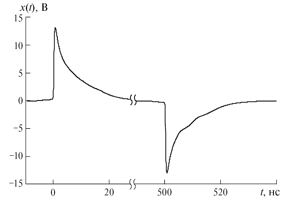 Для реализации изложенного в разд. 2 принципа селекции нелинейного отклика объекта необходимо генерировать пары импульсов противоположной полярности. Серийные генераторы такого типа с требуемой мощностью и длительностью фронта не выпускаются. Поэтому нужно использовать либо специализированную конструкцию в виде двух отдельных генераторов с последующим суммированием сигналов, либо двухтактный обостритель импульсов на диодах с накоплением заряда [20] (2 на рис. 1). Последний вариант проще, и он обеспечивает в нашем случае требуемые параметры. Для описанного в работе [20] обострителя импульсов выходное напряжение составляет 13.1 В (выходная мощность 3.4 Вт), длительность фронта 0.23 нс ( по уровням 20…80% от максимального напряжения). На вход обострителя подается меандр амплитудой ±12 В ( на холостом ходу) от генератора 1 (рис. 1) с внутренним сопротивлением 50 Ом. Мы использовали генератор National Instruments PXI-5422 c длительностью фронта меандра 4 нс. На рис. 3 приведена форма сигнала на выходе обострителя. Спад сигнала экспоненциальный с длительностью около 20 нс. Он не создает существенного зондирующего действия по сравнению с фронтом.