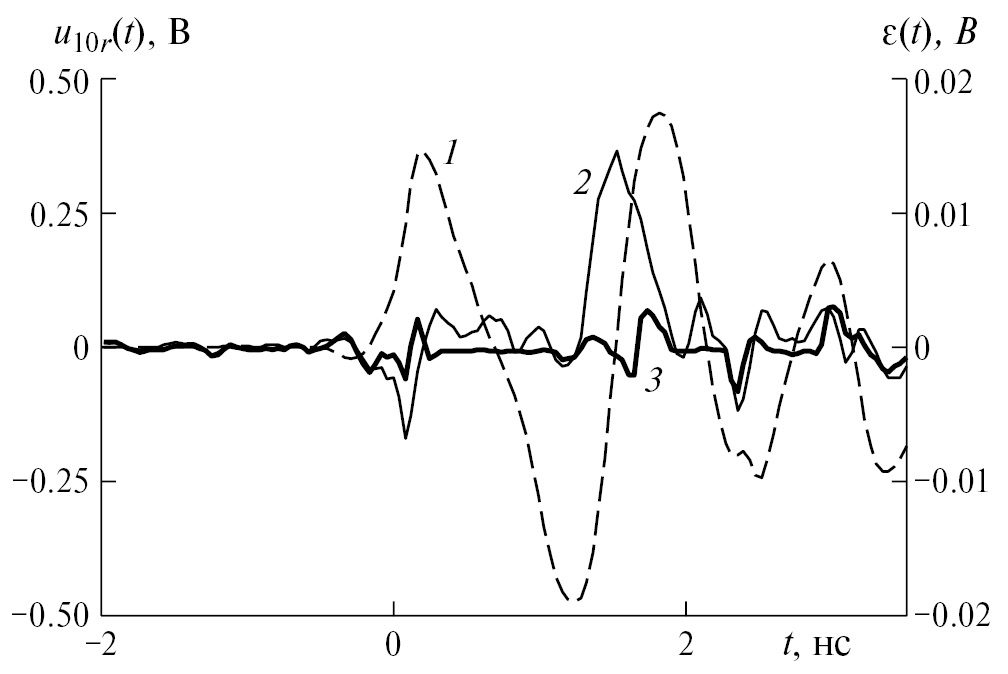 Рис. 7. Отклик u10(t) от пустой камеры (1) и от нелинейной меры (2) (кольцо диаметром 20 мм из медного провода поперечным сечением 4 мм2 с включенным в его разрыв диодом HSMS-8101), а также нелинейный отклик ε(t) от нелинейной меры (3).