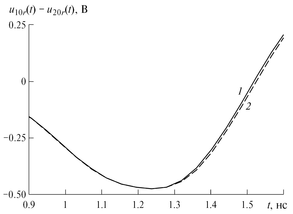 Рис. 5. Отклики u10r(t) и u20r(t) от камеры с линейной мерой на положительный (1) и отрицательный (2) тестовые сигналы. Отклик на отрицательный тестовый сигнал проинвертирован.