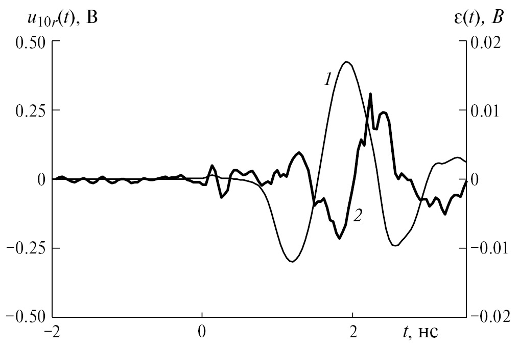 Однако тестирование собственной нелинейности измерительной установки линейной мерой показывает весьма существенный уровень нелинейного отклика (кривая 2 на рис. 4). Его величина составляет 3.1% от отклика камеры с размещенной в ней линейной мерой (кривая 1 ). Природа этой нелинейности становится понятной, если рассмотреть сигналы u10(t) и –u20(t) (рис. 5), разница которых дает характеристику нелинейности ε ( t ). Видно, что разница этих сигналов наблюдается лишь в некоторых областях времени, эта разница может рассматриваться как смещение одного из сигналов относительно другого. Физическим фактором, вызывающим данный эффект, представляется погрешность установки смещения стробирующего импульса в стробоскопическом осциллографе Tektronix DSA 8300. По нашим оценкам взаимное смещение участков сигналов может достигать 10 пс, что при длительности фронта регистрируемых импульсов 230 пс дает относительное значение нелинейности до 4.3%. Отметим, что данный эффект представляется особенностью стробоскопического принципа регистрации сигналов, а не недостатком конкретного осциллографа.