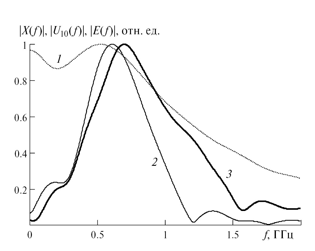 В иллюстративных целях на рис. 9 приведены амплитудные спектры: производной тестового сигнала X(f) (кривая 1), общего U10(f) (кривая 2) и нелинейного Ε(f) (кривая 3) откликов FM-приемника Precision PS-298. Тестовый сигнал перед спектральным преобразованием продифференцирован, потому что электромагнитное воздействие на внутренние нелинейные цепи объекта зондирования определяется изменением поля. Можно видеть, что спектр тестового сигнала занимает полосу частот от нуля до примерно 1 ГГц. Спектр нелинейного отклика объекта ожидаемо расширен в область верхних частот относительно спектра общего отклика, однако, по большей части спектры общего и нелинейного откликов объекта перекрываются. Это указывает на то, что классические методы селекции нелинейного отклика по частотному признаку не подходят в случае видеоимпульсных тестовых воздействий.