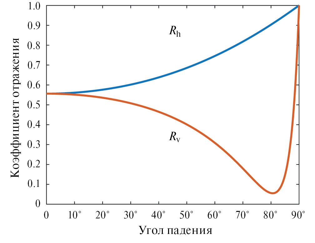 где ε = εʹ + εʺ = ε0·exp(iφ) – комплексная диэлектрическая проницаемость подстилающей поверхности, ε0 – модуль ε, φ – угол потерь, θ – угол падения. По данным исследования [12] комплексная диэлектрическая проницаемость для пресной воды на частоте 36 ГГц составляет ε = 21.7 + 29.96i. На рис. 2 представлены зависимости коэффициентов отражения Rv и Rh от угла падения для пресной воды.