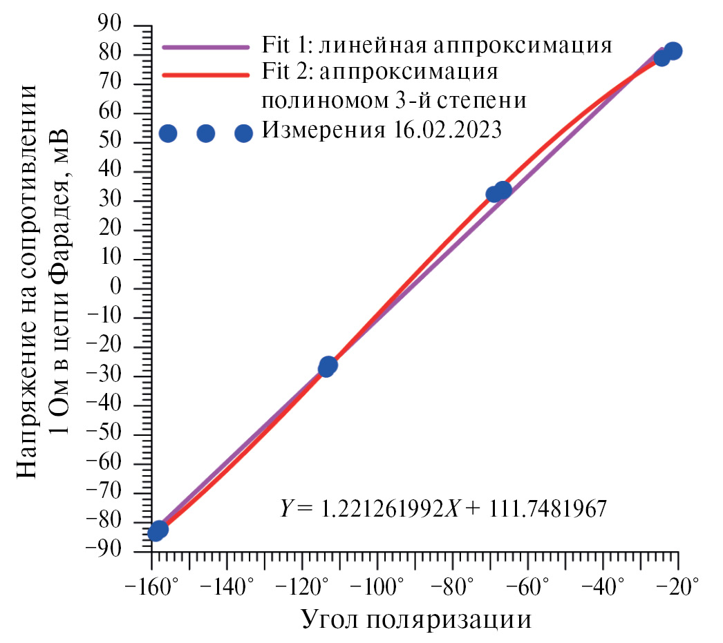 Ток, протекающий через ФВПП, определялся по напряжению на калиброванном сопротивлении 1 Ом в цепи питания ячейки Фарадея. Напряжение на сопротивлении измерялось прецизионным вольтметром В7–22. На рис. 4 продемонстрирована зависимость угла поворота плоскости поляризации от напряжения при сопротивлении 1 Ом в цепи питания ФВПП. Данные аппроксимируются двумя зависимостями: линейной и полиномом третьей степени. На основе полученной зависимости корректировался ток в ФВПП для достижения нужных углов установки поляризаций.