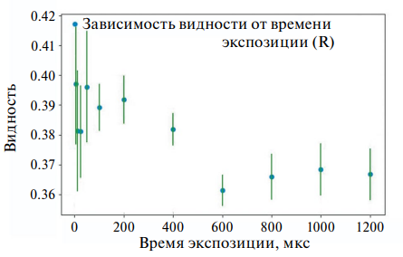 Для проверки линейности камеры и корректности измерений видности варьировалось время экспозиции камеры при фиксированном токе пучка Ib ≈ 100 мА (рис. 5).