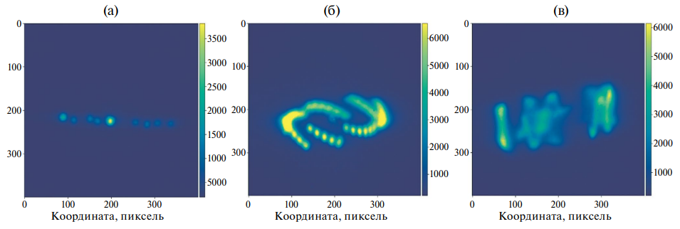 Можно предположить, что отсутствие однооборотных поперечных профилей пучка, подобных тем, что представлены на рис. 6а, б, связано с особенностями записи и считывания изображения CMOS-матрицей камеры.