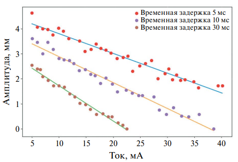Радиальные колебания пучка возбуждались ударом дефлектора, и их амплитуда фиксировалась камерой. На рис. 8 показана зависимость амплитуды колебаний от тока пучка при различных задержках относительно момента удара дефлектором. Как видно, по мере увеличения времени задержки от момента удара дефлектором по пучку скорость затухания колебаний по-разному зависит от тока пучка. При этом амплитуда удара дефлектора во всех случаях была одинаковой.