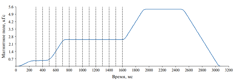 Рис. 1. Цикл магнитного поля бустера и временные интервалы измерений МПП.