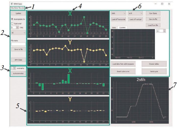 Рис. 2. Интерфейс главного окна программы управления: 1 – выбор отображаемой установки комплекса, 2 – панель управления настройками отображения орбиты, 3 – управление настройками автоматической коррекции орбиты, 4 – графики положения орбиты, 5 – диаграммы отображения токов корректоров, 6 – панель управления системой коррекции орбиты, 7 – отображение текущего тока в выбранном корректоре.