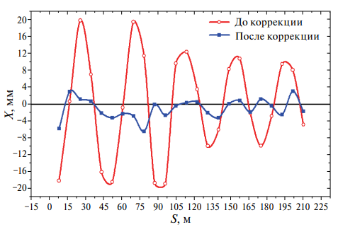 Для расчета требуемых токов питания обмоток корректоров использовался метод наименьших квадратов с применением матричного подхода. Токи в корректорах вычисляются с использованием обратной матрицы отклика орбиты [11], вычисляемой с помощью сингулярного разложения [12]. Базовый алгоритм вычисления обратной матрицы значительно модифицирован и представляет собой итерационный процесс с многократным проходом системы корректоров и МПП, при этом процесс на каждом шаге учитывает ограничения на минимальные и максимальные значения токов корректоров.