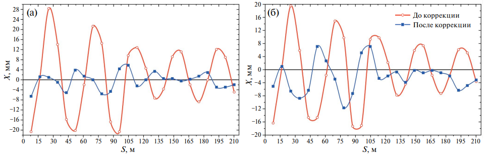 Динамический “пропорциональный” режим работы корректоров был успешно реализован, что стало результатом проведенных работ по согласованию магнитного поля и настроек ускоряющей системы. В результате возмущения орбиты были скомпенсированы при энергии инжекции с 30 до 6 мм (рис. 4а) и при энергии вывода с 20 до 12 мм (рис. 4б). При этом все системы в проведенных сеансах проходили отладку в ходе работ, что влекло за собой многократное изменение настроек, и долговременное сохранение рабочих режимов не наблюдалось. Поэтому большую часть времени не удавалось получить требуемого подобия орбит пучка на протяжении всего цикла ускорения (от инжекции до вывода). Однако принципиальная возможность коррекции орбиты в описанном режиме была продемонстрирована.
