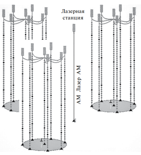 Рис. 1. Лазерная станция, расположенная в геометрическом центре трех кластеров: в состав станции входит лазер и два акустических модема (АМ) системы позиционирования телескопа.