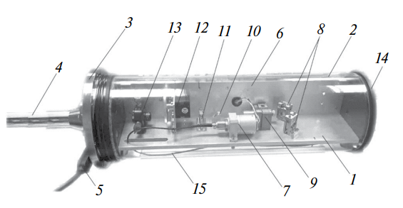 Рис. 3. Конструкция лазерного источника света: 1 – шасси, 2 – пластиковый защитный кожух, 3 – передний глубоководный фланец, 4 – световод, 5 – глубоководный разъем, 6 – вертикальное шасси с закрепленными блоком питания и платой управления, 7 – лазерный излучатель, 8 – поворотные зеркала, 9 – телескоп, 10 – отводная пластина фотоприемника, 11 – фазовая пластина, 12 – управляемый аттенюатор, 13 – рассеивающая линза, 14 – задний внутренний фланец, 15 – оптоволокно линейки накачки лазерного излучателя.