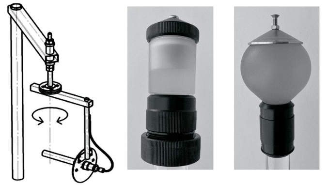 Рис. 4. Схема стенда для исследования угловых характеристик излучателей (слева), фотографии конусного и сферического излучателей (справа).